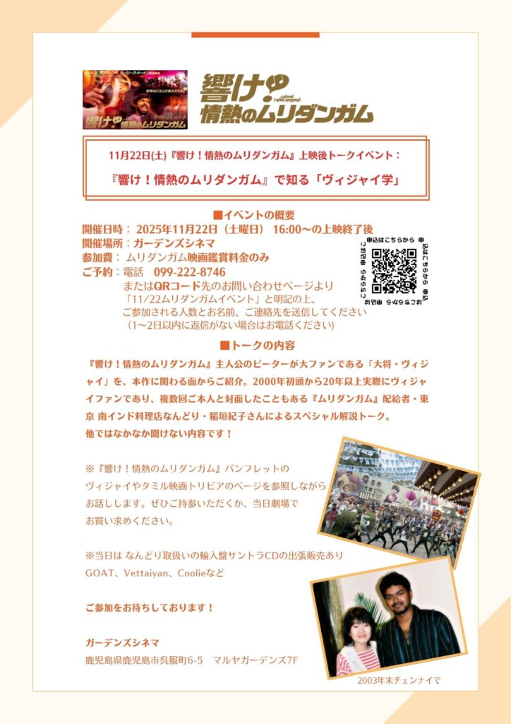11/22(土)『響け!情熱のムリダンガム』マサラ上映 上映後には、配給者・東京 南インド料理店なんどり・稲垣紀子さんによるスペシャル解説トークがございます!! 2025年11月22日(土曜日)16:00〜の上映終了後 続きを読む