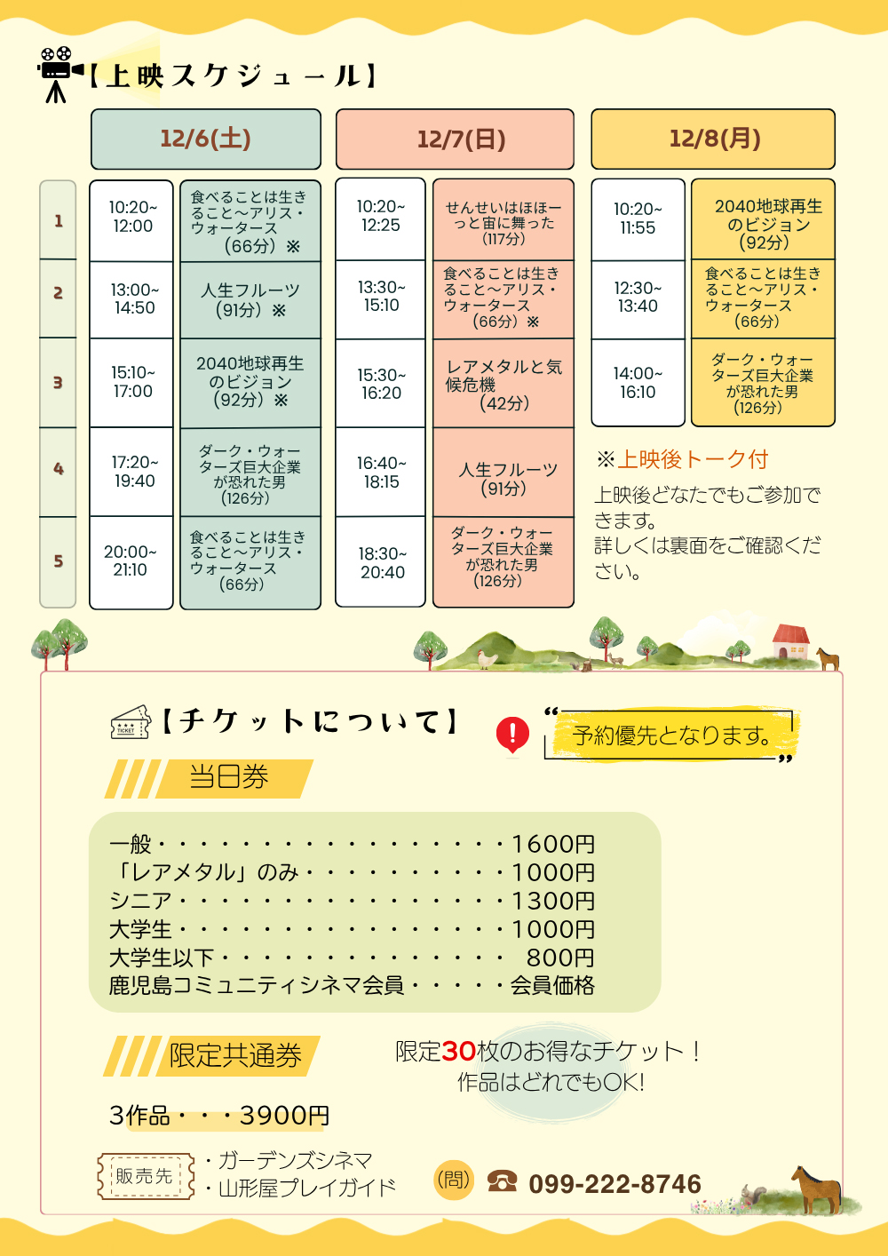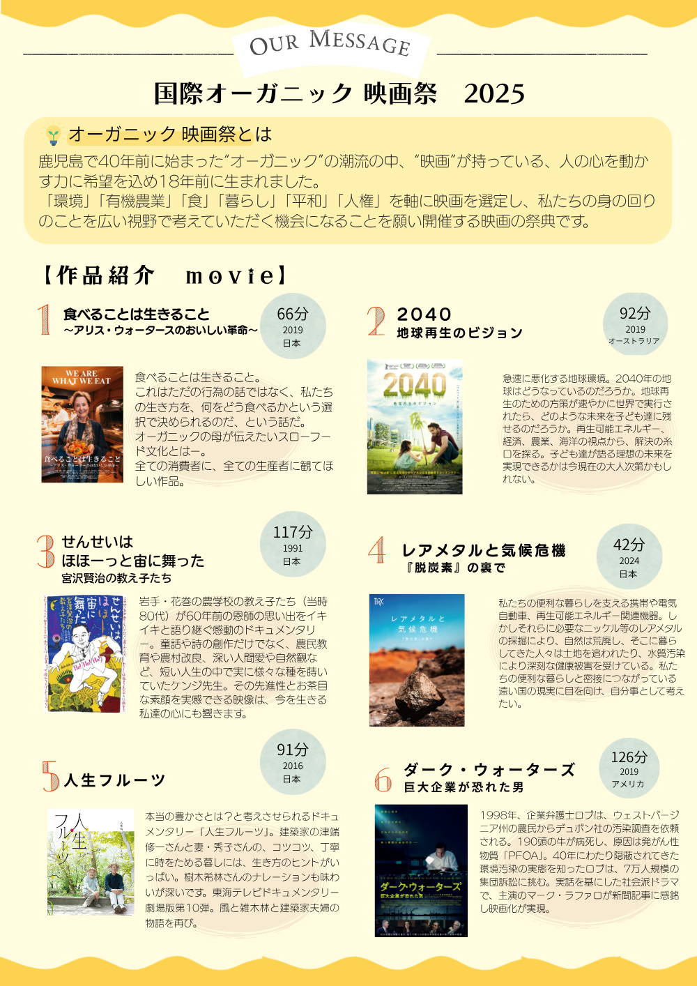 「環境」「有機農業」「食」「暮らし」「平和」「人権」を軸に映画を選定し、私たちの身の回りのことを広い視野で考えていただく機会になることを願い開催する映画の祭典です。