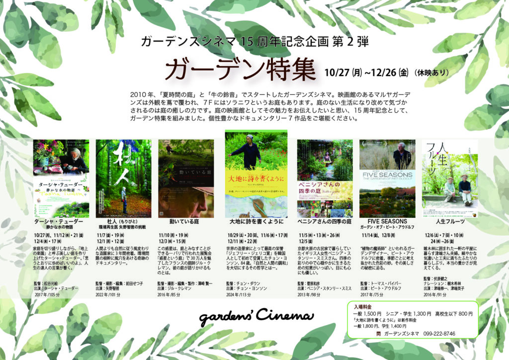 ガーデンズシネマ15周年記念企画 第2弾 ガーデン特集 2010年、「夏時間の庭」と「牛の鈴音」でスタートしたガーデンズシネマ。映画館のあるマルヤガーデンズは外観を蔦で覆われ、7Fにはソラニワというお庭もあります。庭のな続きを読む